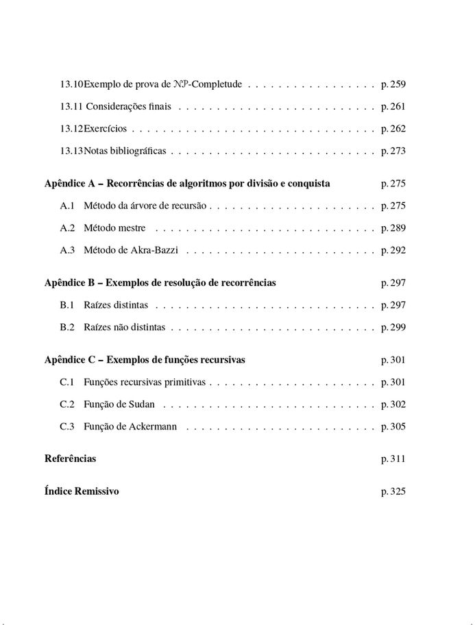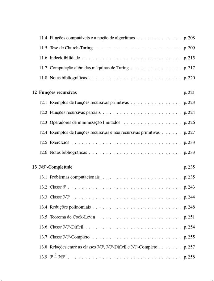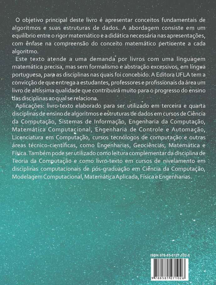 O objetivo deste livro é apresentar conceitos fundamentais de algoritmos e estruturas de dados. Neste livro, consta revisão de matemática básica, introdução a técnicas de construção de algoritmos, análise de complexidade, algoritmos em grafos, teoria da computação e NP-Completude. A abordagem consiste em um equilíbrio entre o rigor matemático e a didática necessária nas apresentações, com ênfase na compreensão do conceito matemático pertinente a cada algoritmo. Este livro atende a uma demanda por livros com uma linguagem matemática precisa, mas sem formalismo e abstração excessivos, em língua portuguesa, para as disciplinas nas quais foi concebido. A Editora UFLA tem a convicção de que entrega a estudantes, professores e profissionais da área um livro de altíssima qualidade que contribuirá muito para o ensino de algoritmos. A obra foi elaborada para ser utilizada como livro-texto de terceira e quarta disciplinas de algoritmos em cursos de Ciência da Computação, Sistemas de Informação, Engenharia da Computação, Matemática Computacional, Engenharia de Controle e Automação, Licenciatura em Computação, cursos tecnólogos de computação e outras áreas técnico-científicas, como Engenharias, Geociências, Matemática e Física. Também pode ser utilizado como leitura complementar da disciplina de Teoria da Computação e como livro-texto em cursos de nivelamento em disciplinas de pós-graduação em Ciência da Computação, Modelagem Computacional, Matemática Aplicada, Física e Engenharias.