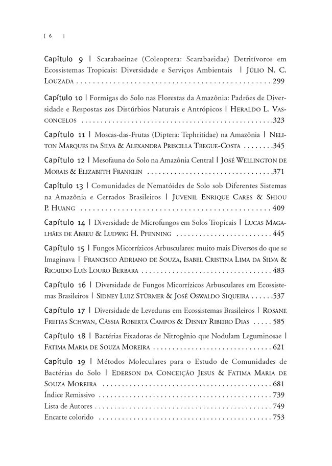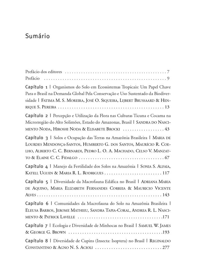 O solo é considerado o ecossistema mais complexo e dinâmico do planeta, cuja heterogeneidade de habitats, que varia na escala de nanômetros até quilômetros, abriga enorme biodiversidade que desempenha papel essencial para a continuidade dos processos da biosfera e para a existência da vida. Apesar do grande volume de informações já acumuladas, que nos permite fazer tais inferências, nosso real conhecimento sobre a dimensão, diversidade e papel da pedobiota ainda é incipiente, principalmente em se tratando da região tropical que abriga, reconhecidamente, cerca de 50 % de todas as espécies do planeta. Editar e escrever esta obra em parceria com 45 pesquisadores de diferentes instituições do Brasil e também do exterior, foi uma tarefa instigante e valiosa que nos permitiu conhecer e integrar diversas facetas da biodiversidade do solo, e assim contribuir para diversas ações e pesquisas futuras. Parte desta obra é a tradução para a língua portuguesa do livro: Soil Biodiversity in Amazonian and Other Ecosystems publicado em 2006 pela CABI, cujos direitos para publicação em português foram garantidos no contrato com esta editora, pois pretendíamos atingir um público mais amplo e diverso no Brasil, visando a contribuir para a conscientização sobre este assunto tão importante e atual e que diz respeito a todos nós, detentores da maior megadiversidade entre as nações tropicais. Os onze capítulos publicados na versão em inglês foram atualizados e oito novos capítulos foram adicionados, ampliando as informações sobre um maior número de grupos de organismos relevantes. Apesar de a Biologia do Solo ser muito antiga no mundo, ela é bastante recente no Brasil, e esta obra representa a primeira publicação que aborda de forma abrangente a diversidade e função de diversos grupos chave que compõem a biota do solo.