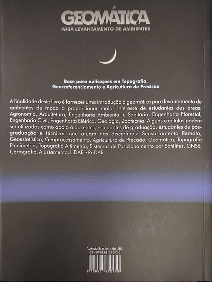 A finalidade deste livro é fornecer uma introdução à geomática para levantamento de ambientes de modo a proporcionar maior interesse de estudantes das áreas: Agronomia, Arquitetura, Engenharia Ambiental e Sanitária, Engenharia Florestal, Engenharia Civil, Engenharia Elétrica, Geologia, Zootecnia. Alguns capítulos podem ser utilizados como apoio a docentes, estudante de graduação, estudante de pós-graduação e técnicos que atuam nas disciplinas: Sensoriamento Remoto, Geoestatística, Geoprocessamento, Agricultura de Precisão, Geomática, Topografia Planimetria, Topografia Altimetria, sistemas de Posicionamento por Satélites, GNSS, Cartografia, Ajustamento, LiDAR e RaDAR.